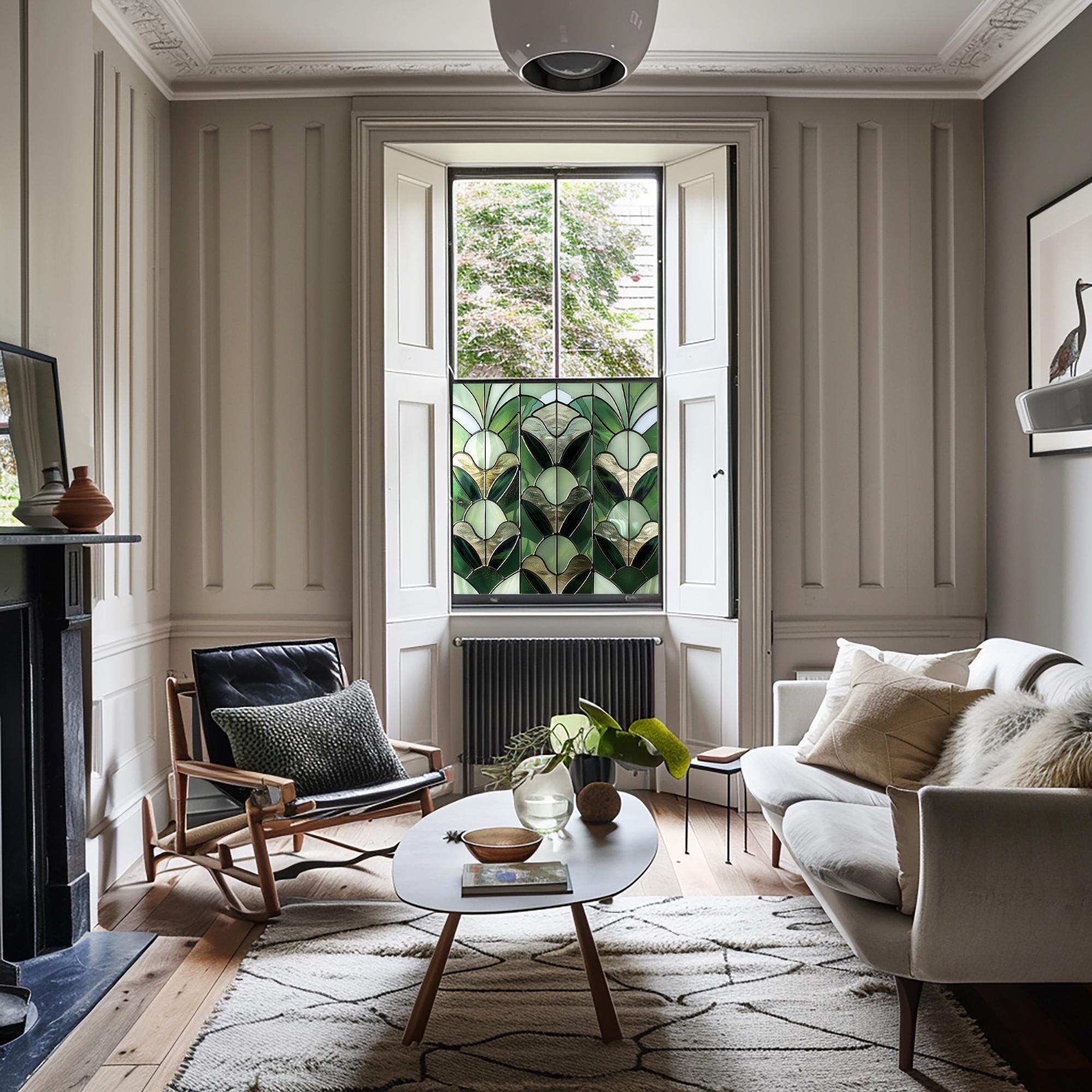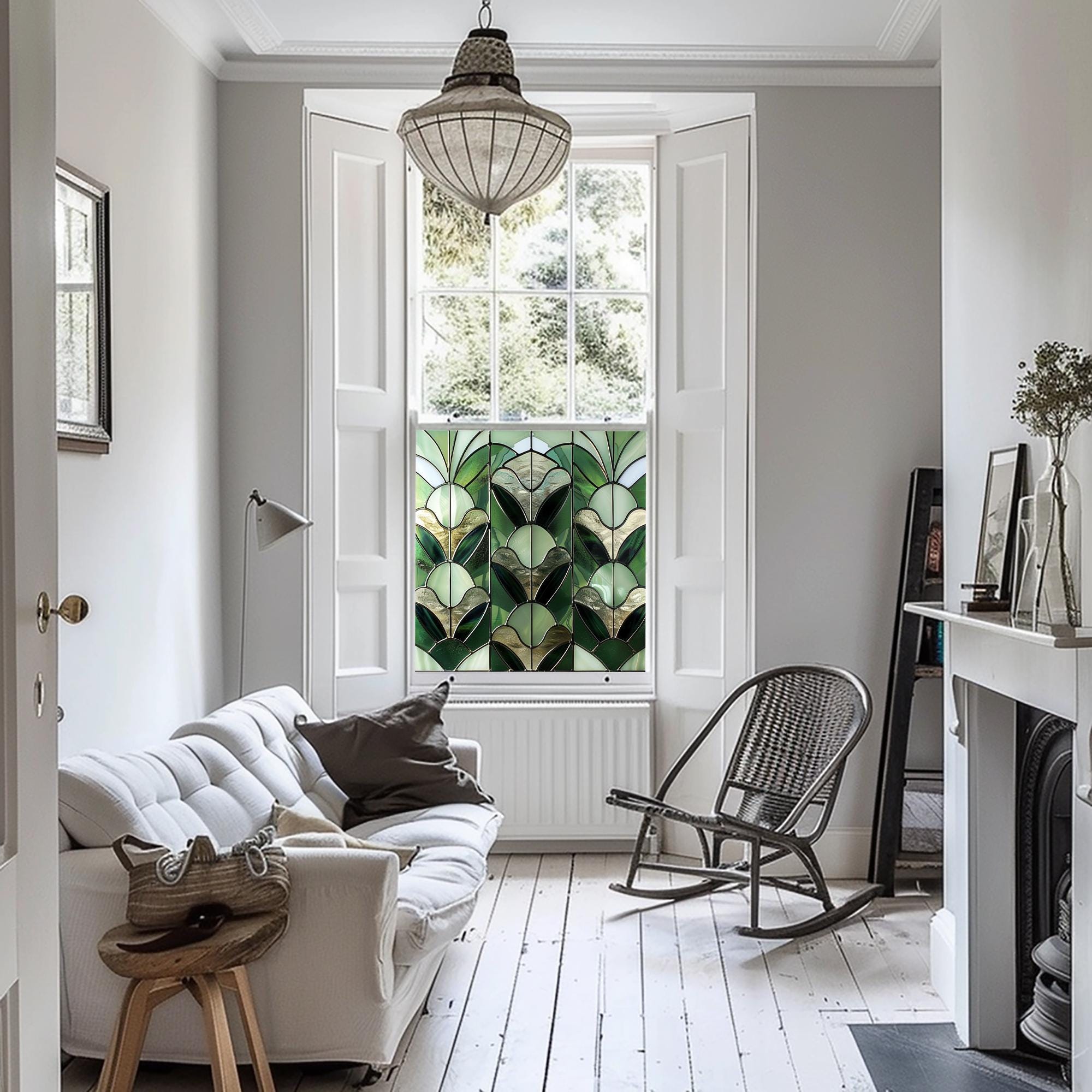 The Atrani Stained Glass Privacy Window Film brings a touch of elegance and sophistication to any room. With its vibrant green hues and Art Deco design, this window film mimics the appearance of stained glass without the hefty price tag. It adds an instantly stylish look while filtering natural light, so your space remains bright yet inviting. This combination of beauty and functionality makes it a great addition to kitchens, living rooms, or any area where you want to enhance your decor.