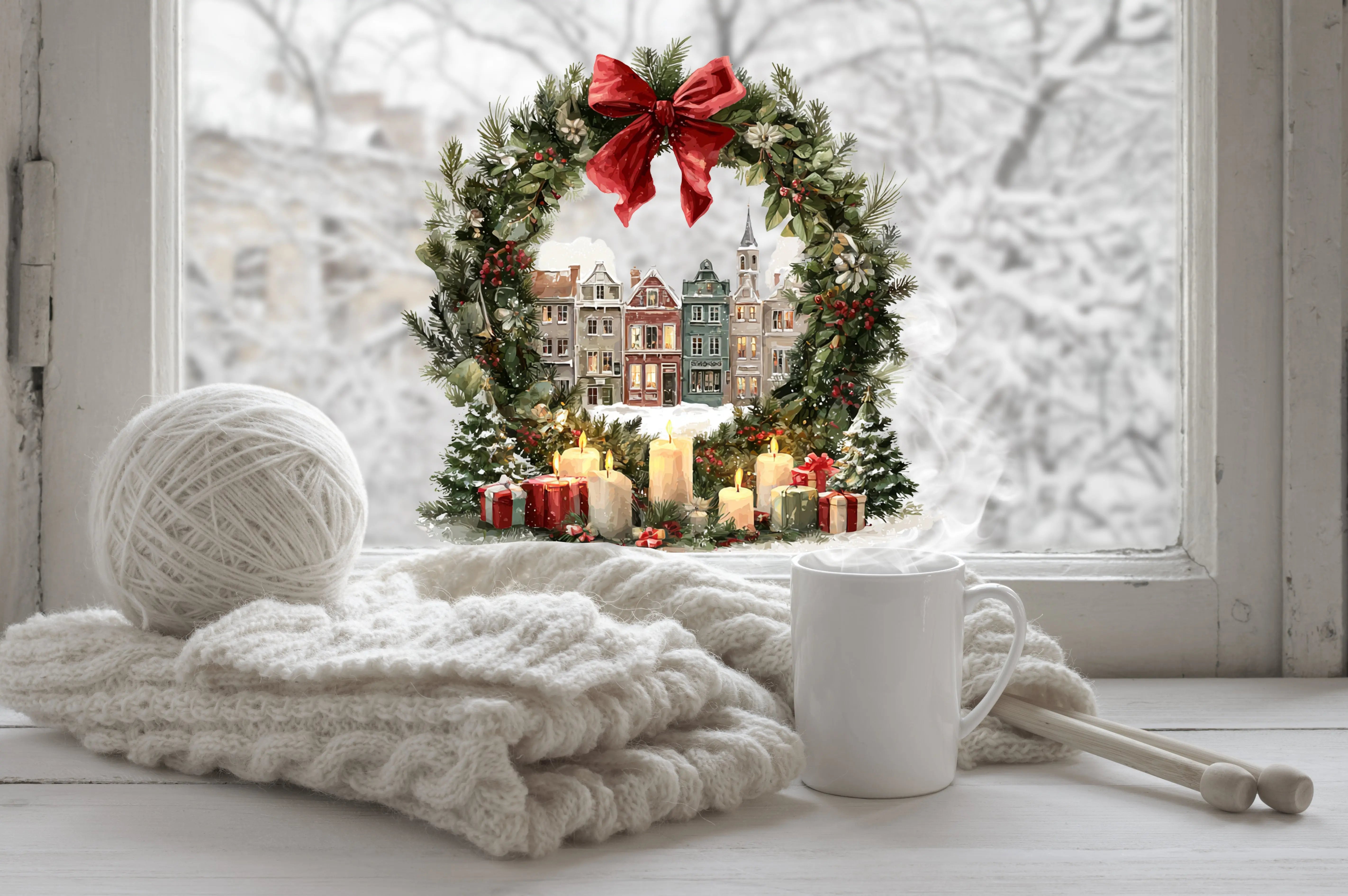 Christmas Village Wreath Window Sticker – Double Sided Reusable Festive Decor