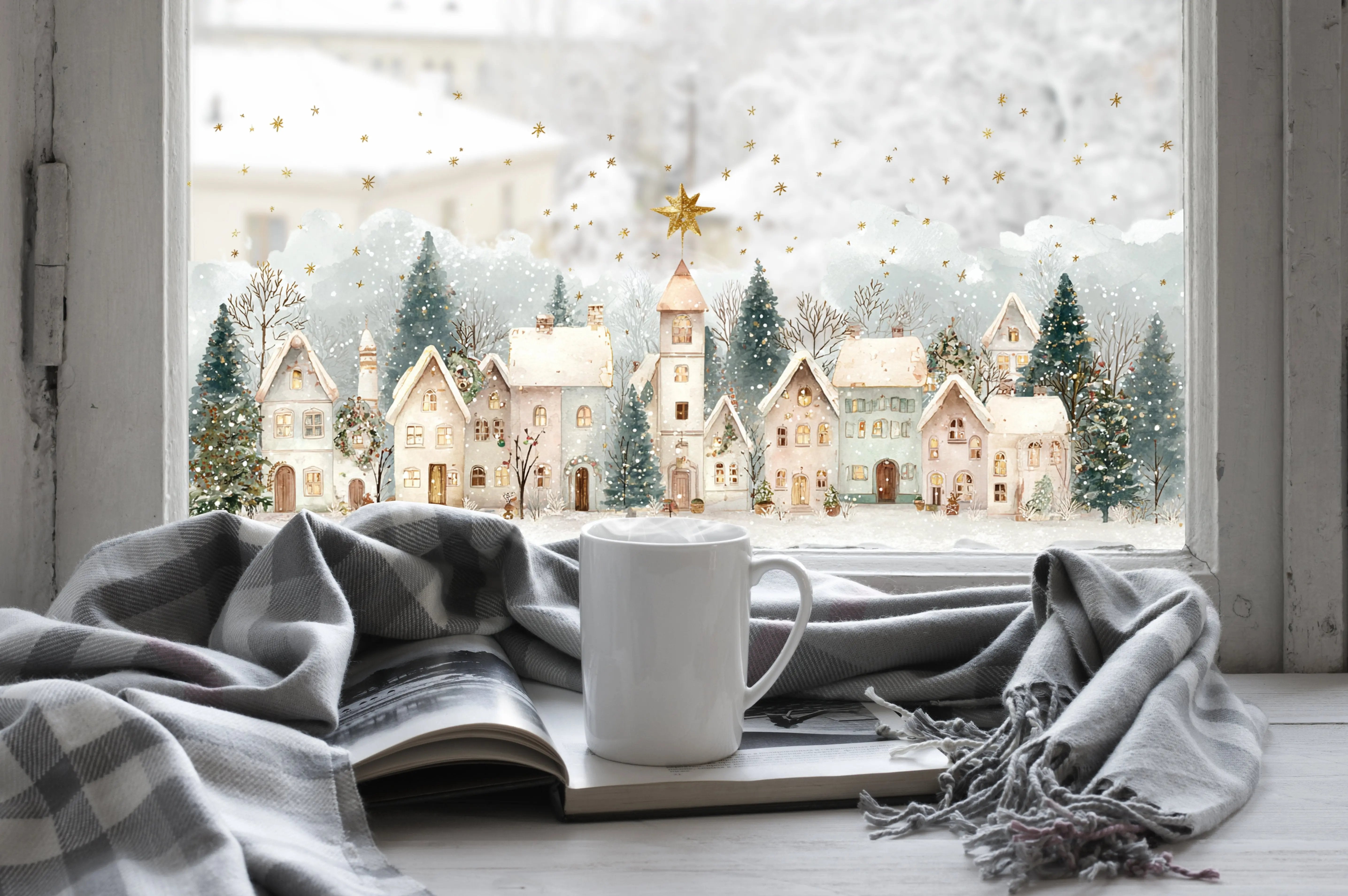 Christmas Window Sticker, Winter Town Scene, Double-Sided Reusable Decal